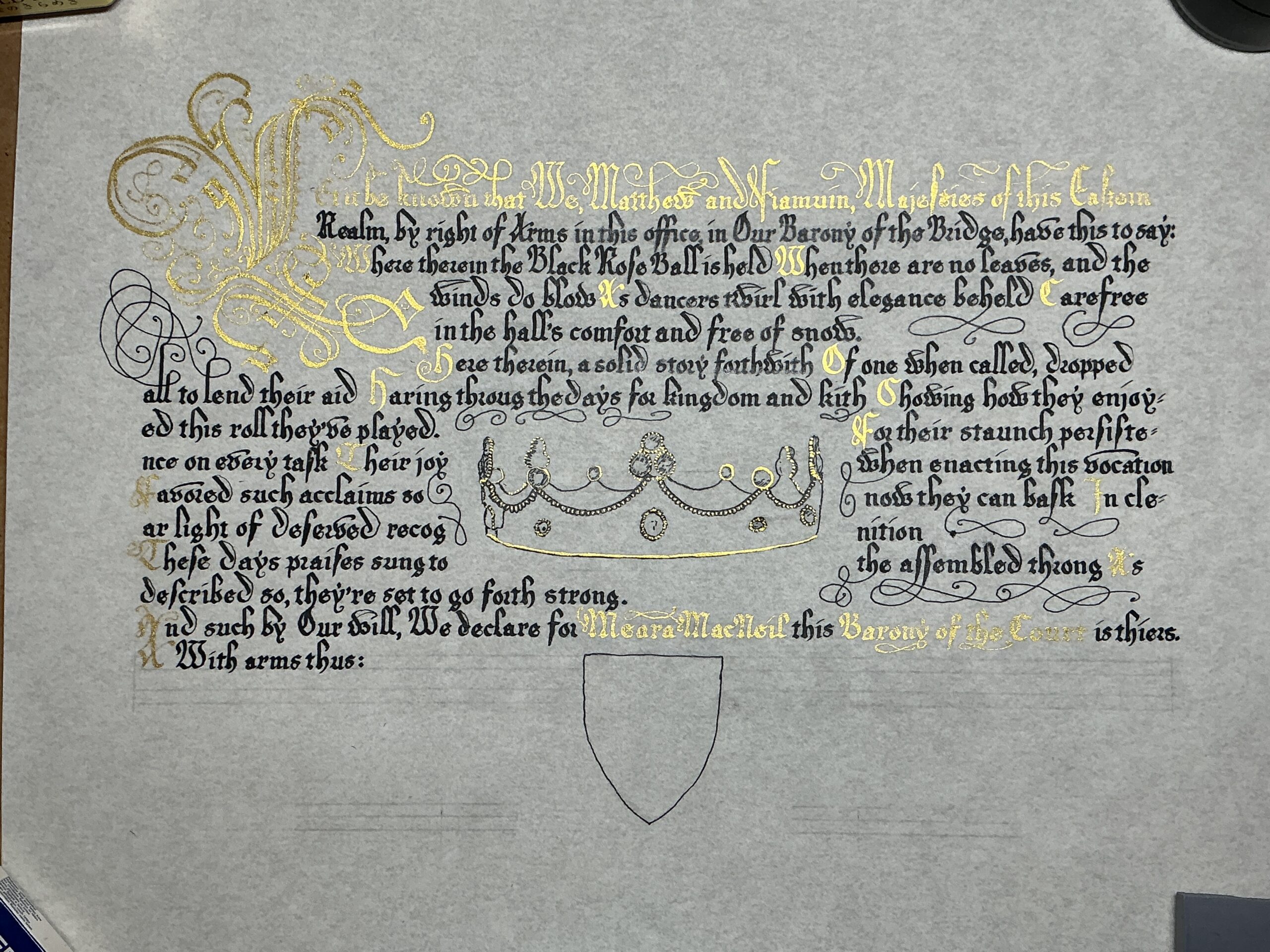 And such by Our will, We declare for Meara MacNeil this Barony of the Court is theirs.
