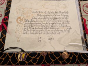 Oh man was I torn on how to go about this one. Meara had requested a personal commission based on the Vespasian Psalater, but the wording didn’t quite work out for that layout. I could have made it work, but it would have been a little more limiting if I stuck with that style. So I elected on a legal document, with a Cadel directly from the Mira Calaigraphea. This also gave me the opportunity to include a pen drawing of the actual Cornet being passed down to them. The cornet was passed to them as they were the next in the Protege family to receive a Court Barony. This is a first for me, so I was kind of excited!